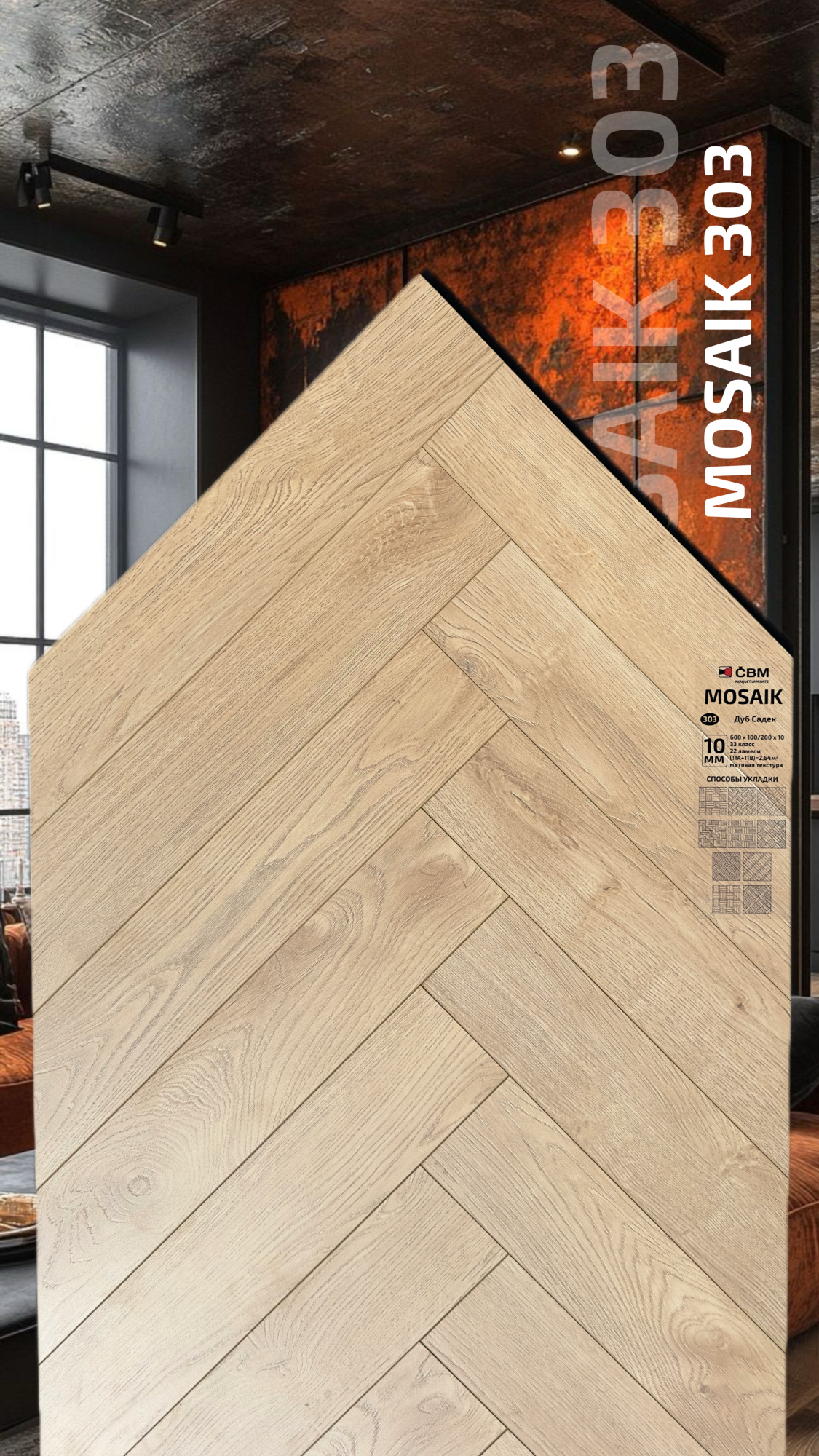 Страна производства Чехия Коллекция Mosaik Класс пожарной опасности КМ 3 Производители ламината Cbm Класс ламината 33 Толщина доски ламината 10 мм Размеры доски ламината 600х100 мм Вид\Имитация материала Ёлочка Упаковка ламината 2,64 м2, досок (22А+22В), 23,4 кг. Наличие фаски ламината 4х-сторонняя Влагостойкость ламината Повышенная Срок эксплуатации ламината (в домашних условиях) 25 лет -
