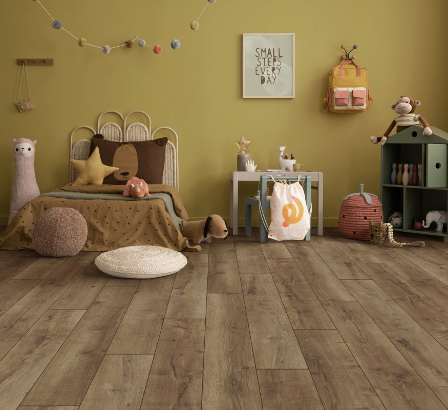 Покрытие толщиной 8 мм с четырехсторонней фаской создает эффект пола из настоящей дубовой доски. Класс износостойкости 33 (AC5) указывает на то, что ламинат выдерживает интенсивные нагрузки в жилых помещениях и коммерческих пространствах с умеренной проходимостью.